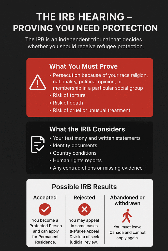 The IRB reviews evidence, holds a hearing, and decides whether you qualify as a Convention refugee or a person in need of protection.