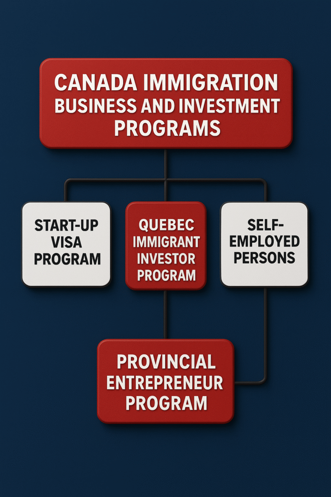 Canada offers several business immigration pathways for entrepreneurs, investors, and self-employed professionals who want to start or expand a business and gain permanent residency. Key options include the Start-Up Visa, Self-Employed Persons Program, Provincial Entrepreneur Streams, and the Quebec Immigrant Investor Program (QIIP).