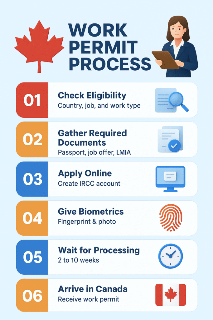 π At the Canadian border, a border services officer issues your work permit which outlines: employer (if specific), job role, place of work, and duration.